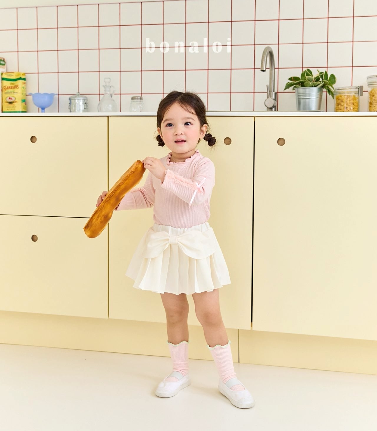 春らしいパステルカラーに袖口のフリルとリボンがポイントのトップスです。