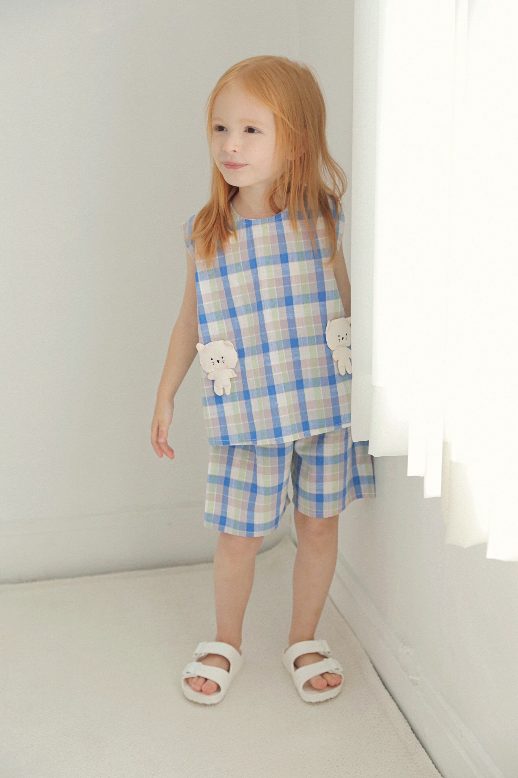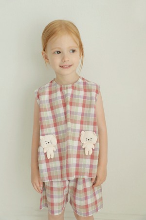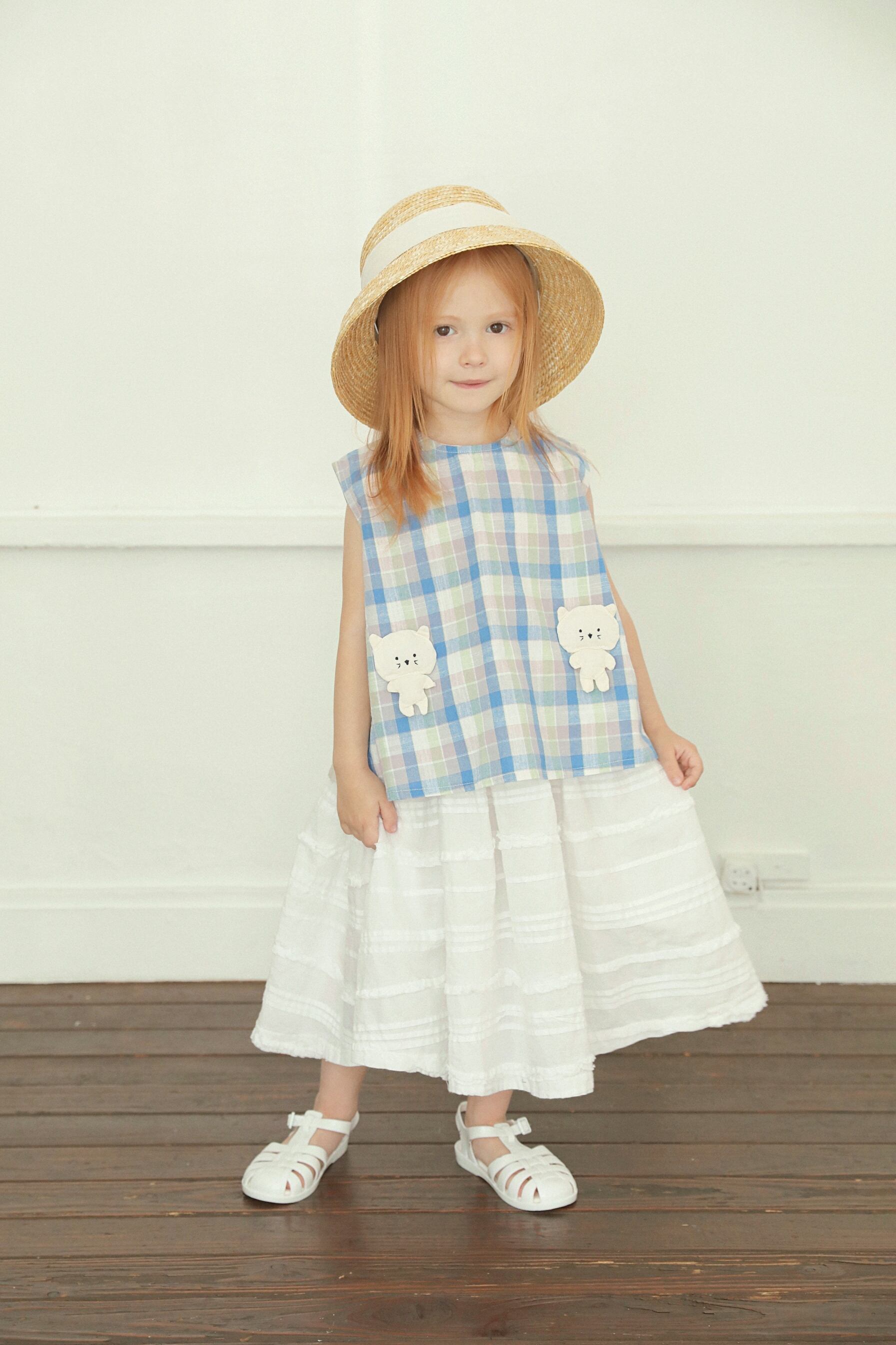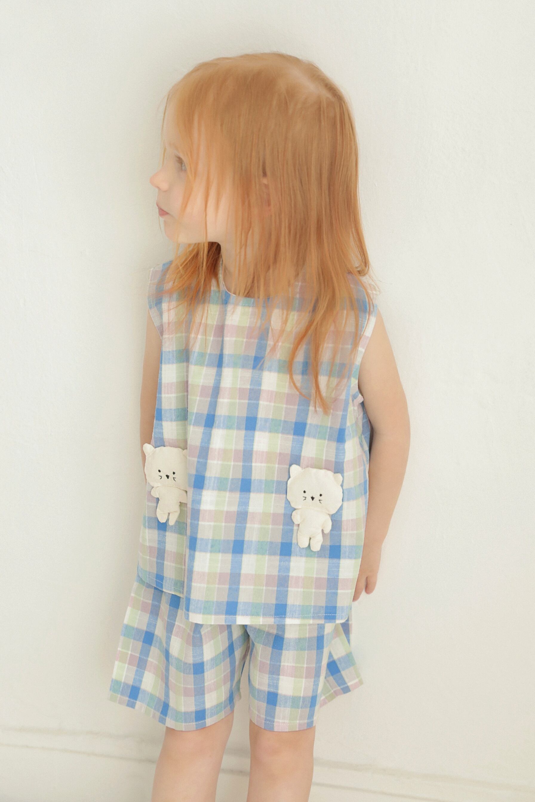 Bien a Bienらしいチェック柄のカラー感にネコの飾りが可愛いノースリーブです。