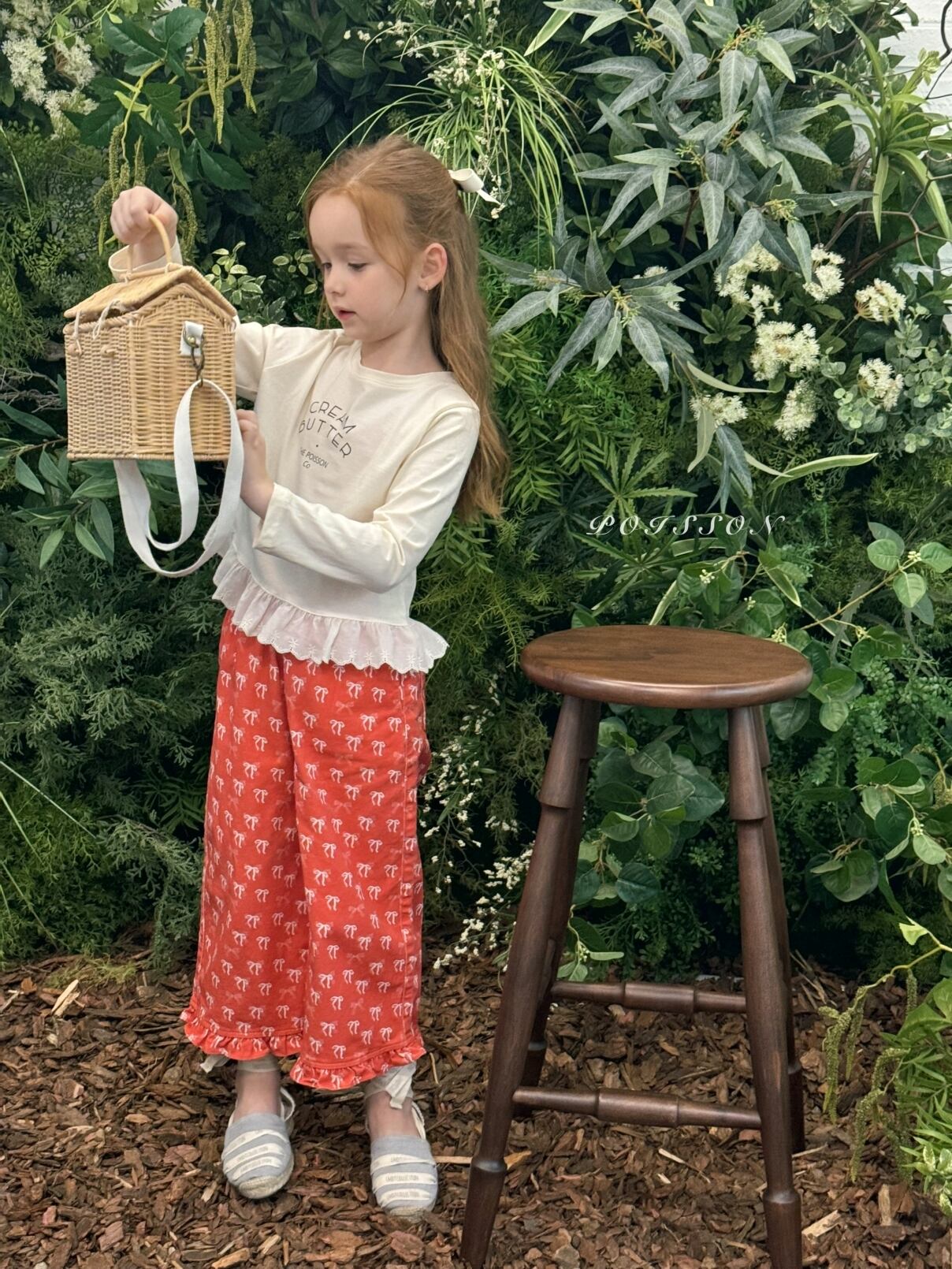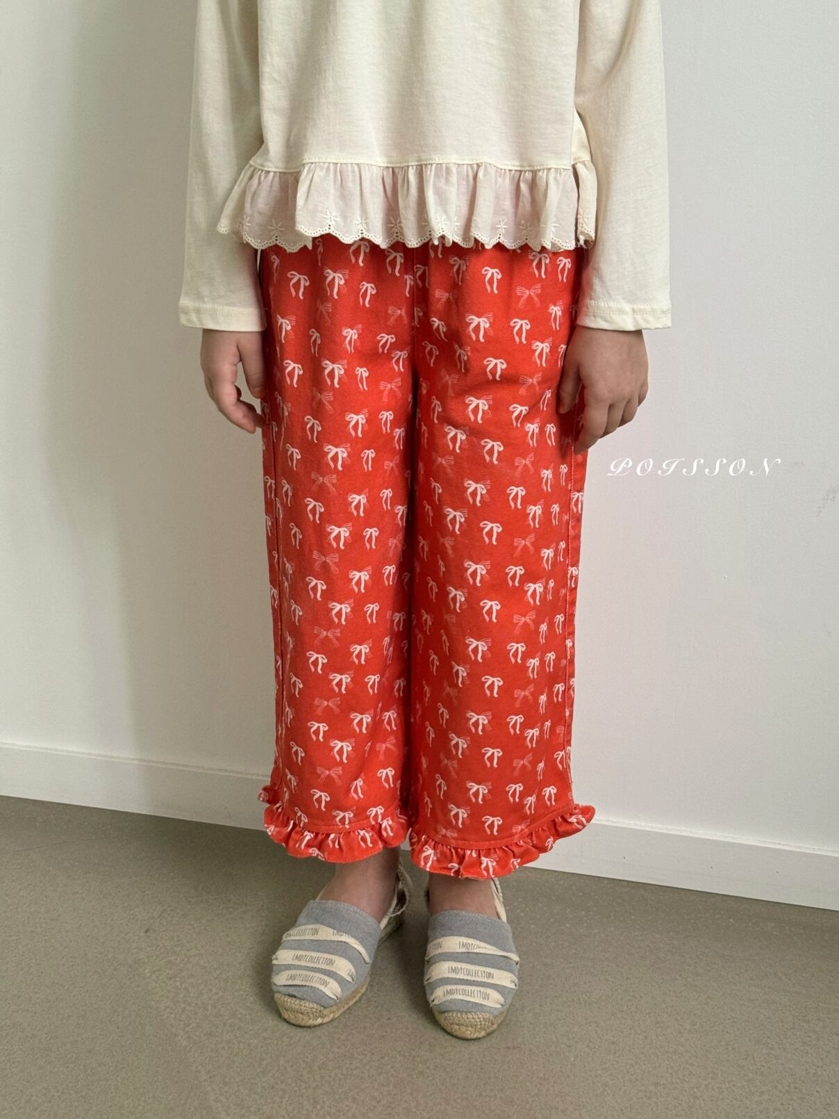 程よいワイドシルエットにリボン柄と裾のフリルがロマンチックな印象のコットンパンツです。