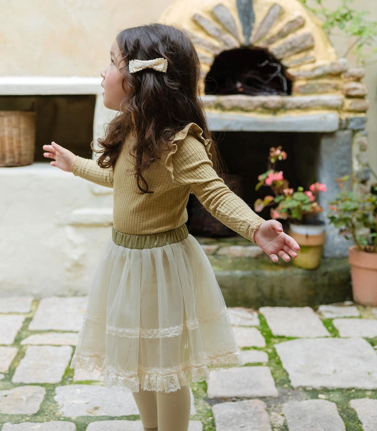 チュールをたっぷり重ねてふんわり仕立てたスカートは色んなトップスとと合わせてコーディネートの幅が広がります。