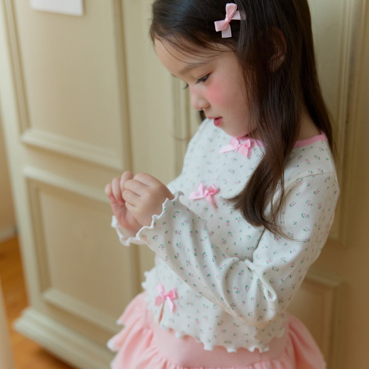 フロントには小さなリボンを三つあしらい、さりげないアクセントに。